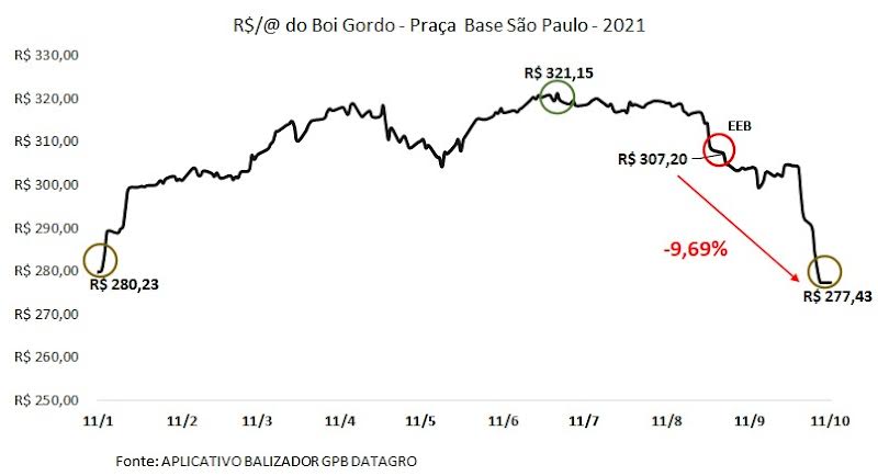 - Em setembro, com a divulgação de dois casos atípicos em MT e MG de Encefalopatia Espongiforme Bovina na data de 04/09/2021, o comportamento do preço da arroba a nível Brasil e não somente em São Paulo foi de baixa.