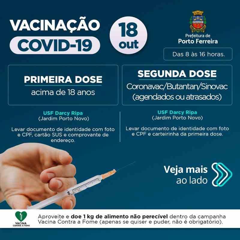 A Vigilância Epidemiológica de Porto Ferreira informa como será o esquema de vacinação contra a covid-19 nesta segunda-feira (18/10).