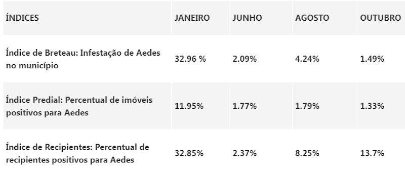 Foi realizada uma amostragem em 603 imóveis nos bairros do município. Após a análise dos dados, verificou-se a oscilação dos índices nos períodos de janeiro a outubro de 2021.