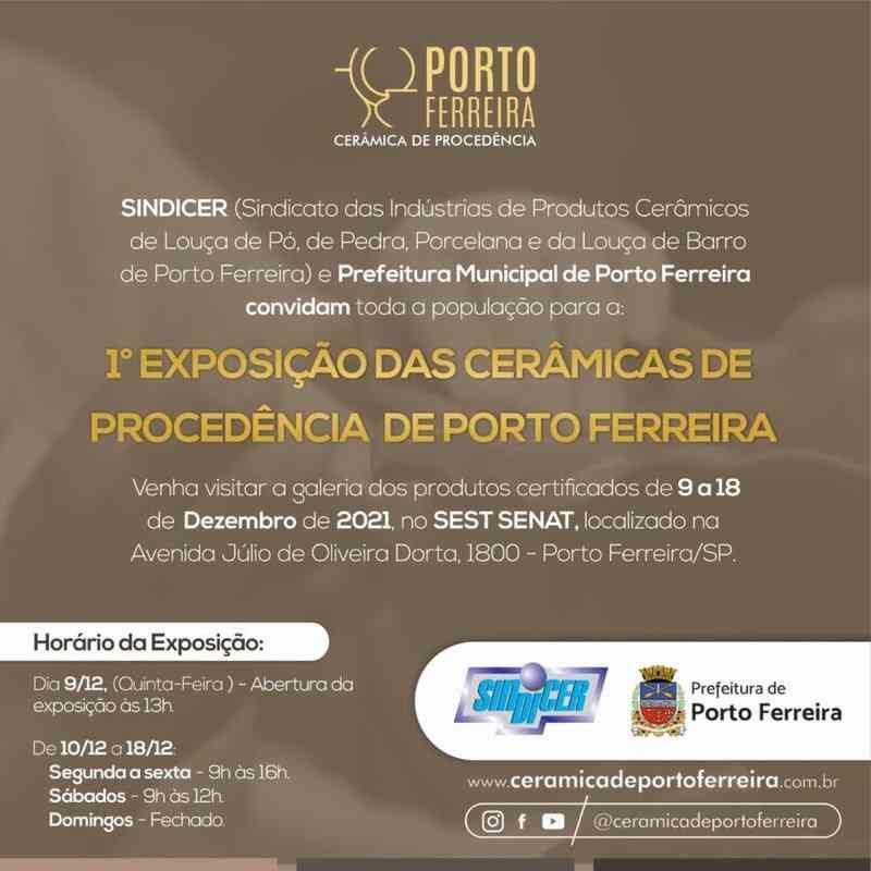 O Sindicer (Sindicato das Indústrias Cerâmicas) e a Prefeitura de Porto Ferreira, por meio da Secretaria de Desenvolvimento Econômico e Turismo, convidam toda a população para prestigiar a 1° Exposição das Cerâmicas de Procedência de Porto Ferreira.