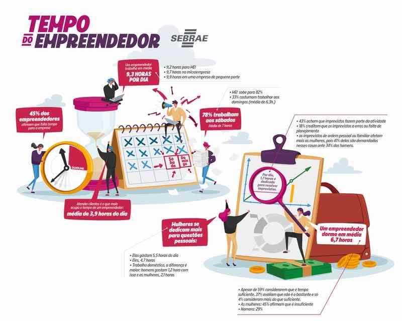 A jornada de trabalho dos empreendedores costuma ser mais longa do que o expediente padrão de muitos funcionários com registro em carteira; além disso, boa parte deles trabalha aos sábados e domingos e, mesmo assim, há aqueles que afirmam faltar tempo para cuidar da empresa. Essas são algumas das conclusões da pesquisa "Tempo do empreendedor", realizada pelo Sebrae-SP.
