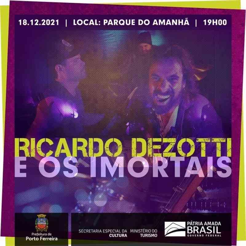 A Secretaria de Cultura e Economia Criativa de Porto Ferreira realiza na noite deste sábado, dia 18 de dezembro, o show da banda Ricardo Dezotti e os Imortais, a partir das 19 horas, no Parque do Amanhã.