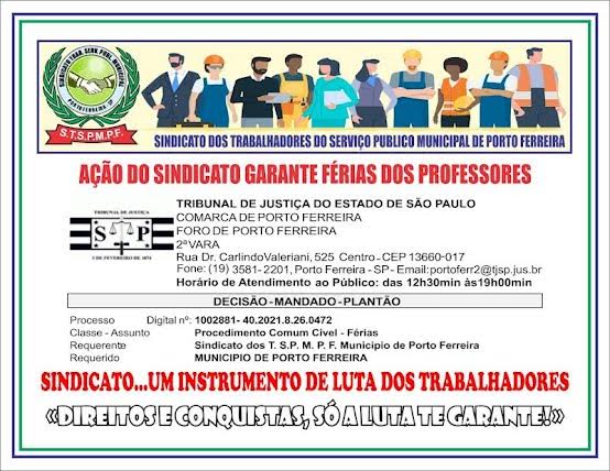 O Sindicato após ingressar com Ação Judicial conseguiu o deferimento da Tutela de Urgência onde foi concedido férias no mês de janeiro a todos os Professores que ingressaram na Municipalidade anteriormente a 2021.