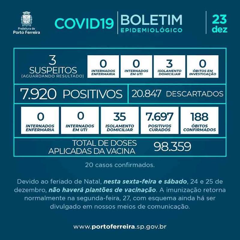 A Vigilância Epidemiológica da Secretaria de Saúde de Porto Ferreira divulgou neste quinta-feira (23/12) o Boletim Epidemiológico nº 618/2021, atendendo à determinação prevista no decreto municipal 1.281/2020, informa que nas últimas 24 horas foram confirmados mais 20 casos positivos, e na data de hoje o município esta com 38 casos positivos em isolamento domiciliar, nenhum paciente está internado em UTI e/ou Enfermaria.
