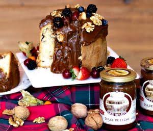 Montagem: Faça um furo redondo na parte superior do Chocotone. Tire uma parte do miolo, acrescente o Doce de Leite Argentino e tampe o Chocotone com a própria massa. Despeje um pouco do doce por cima do Panetone e decore com as frutas a sua escolha.