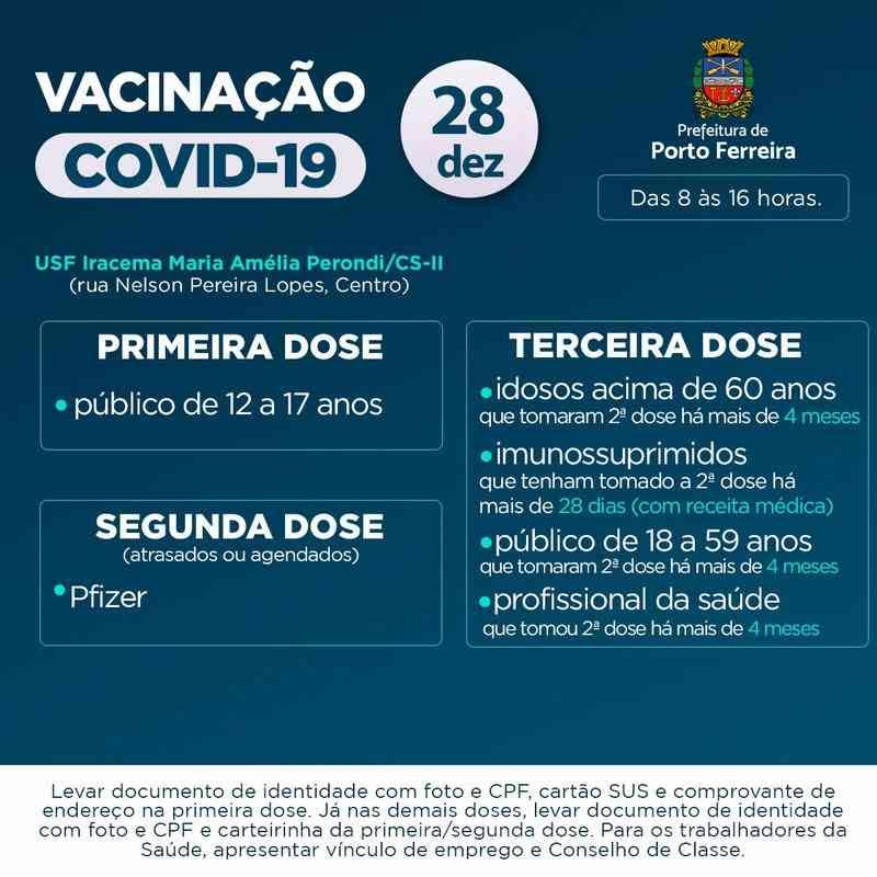 A Vigilância Epidemiológica de Porto Ferreira informa como será o esquema de vacinação contra a covid-19 nesta terça-feira (28/12), das 8h às 16h. Veja programação: