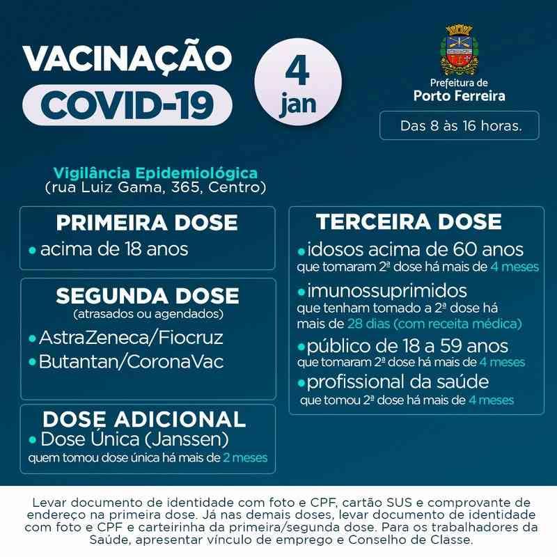 A Vigilância Epidemiológica de Porto Ferreira informa como será o esquema de vacinação contra a covid-19 nesta terça-feira (04/01), das 8h às 16h. Veja programação: