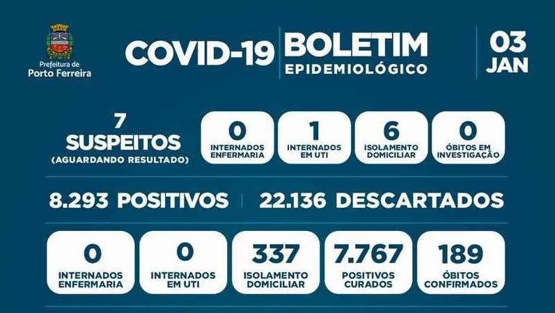 A Vigilância Epidemiológica da Secretaria de Saúde de Porto Ferreira divulgou nesta segunda-feira (03/01) o Boletim Epidemiológico nº 628/2021, atendendo à determinação prevista no decreto municipal 1.281/2020. Um óbito de paciente de 49 anos registrado semana passada, que estava com suspeita para covid-19, deu resultado negativo.