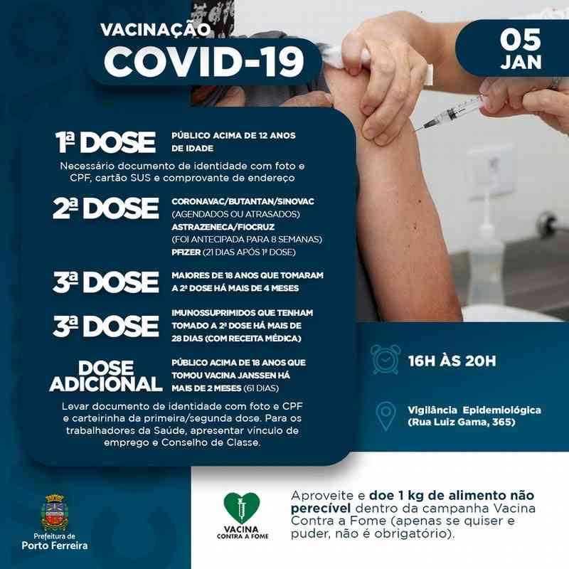A Vigilância Epidemiológica de Porto Ferreira informa como será o esquema de vacinação contra a covid-19 nesta quarta-feira (05/01), das 16h às 20h. No dia de hoje houve aumento na procura e as doses se esgotaram. Mas a previsão é de chegada amanhã durante o dia, por isso o horário em esquema de plantão das 16h às 20h. Veja programação: