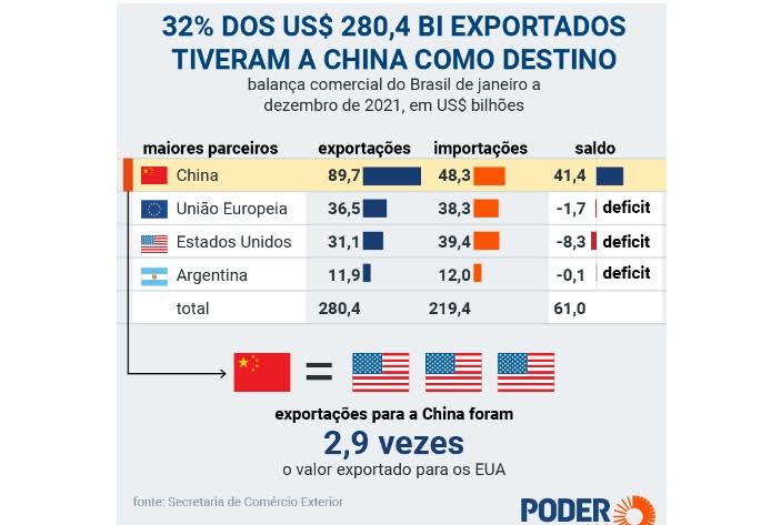 China é o principal parceiro comercial do Brasil e ajudou em muito o país a ter resultado positivo na balança comercial no ano de 2021. O país asiático foi o destinatário quase U$ 90 bilhões das exportações brasileiras, ou seja, mais de 30% dos US$ 280 bilhões exportados no ano 2021.