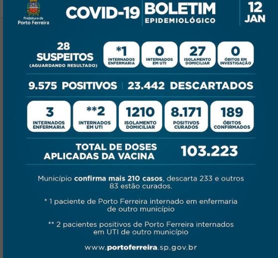 A Vigilância Epidemiológica da Secretaria de Saúde de Porto Ferreira divulgou nesta quarta-feira (12/01) o Boletim Epidemiológico nº 637/2021, atendendo à determinação prevista no decreto municipal 1.281/2020.