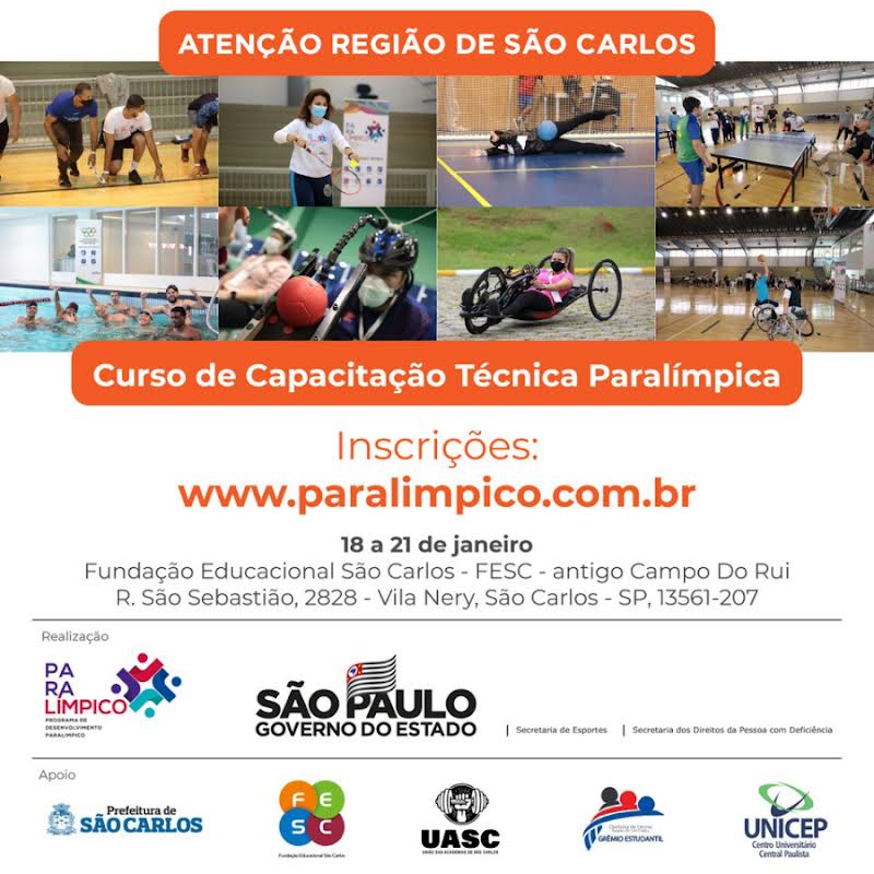 Entre os dias 18 e 21 de janeiro, São Carlos receberá o projeto PARALÍMPICO (Programa de Desenvolvimento Paralímpico), uma iniciativa do Governo do Estado de São Paulo por meio das Secretarias de Estado de Esportes e dos Direitos da Pessoa com Deficiência, que visa fomentar o esporte paralímpico de base. O projeto tem como foco professores de educação física da rede pública, privada, de entidades e clubes, além de alunos de graduação do último ano de educação física e educadores que trabalham com práticas esportivas. Profissionais e graduandos de toda a região podem participar.