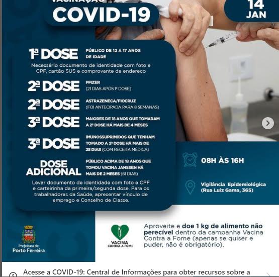 A Vigilância Epidemiológica de Porto Ferreira informa como será o esquema de vacinação contra a covid-19 nesta sexta-feira (14/01), das 8h às 16h, em dois locais.
