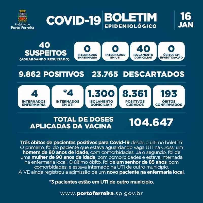 A Vigilância Epidemiológica da Secretaria de Saúde de Porto Ferreira divulgou neste domingo (16/01) o Boletim Epidemiológico nº 641/2022, atendendo à determinação prevista no decreto municipal 1.281/2020.