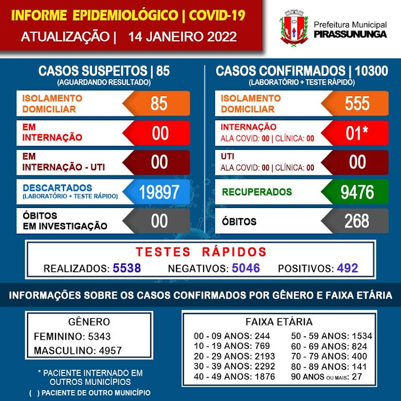 No fechamento desta sexta-feira, 14, o município registrava 555 pessoas positivadas para o Covid-19, uma pessoa internada em outro município e 85 pessoas aguardam por resultado.