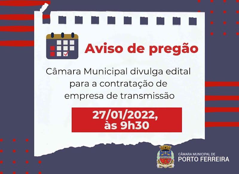 A Câmara Municipal de Porto Ferreira divulgou, nesta quarta-feira (12/01), o edital de Pregão Presencial nº 01/2022, destinado à contratação de serviços de filmagem e gravação de imagens para transmissão “ao vivo” via internet das sessões plenárias e outros eventos do Legislativo Municipal.