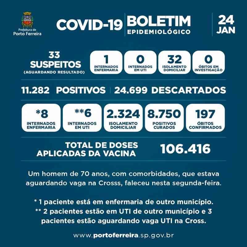 A Vigilância Epidemiológica da Secretaria de Saúde de Porto Ferreira divulgou nesta segunda-feira (24/01) o Boletim Epidemiológico nº 649/2022, atendendo à determinação prevista no decreto municipal 1.281/2020. Um homem de 70 anos, com comorbidades, que aguardava leito de UTI na Cross morreu na data de hoje.