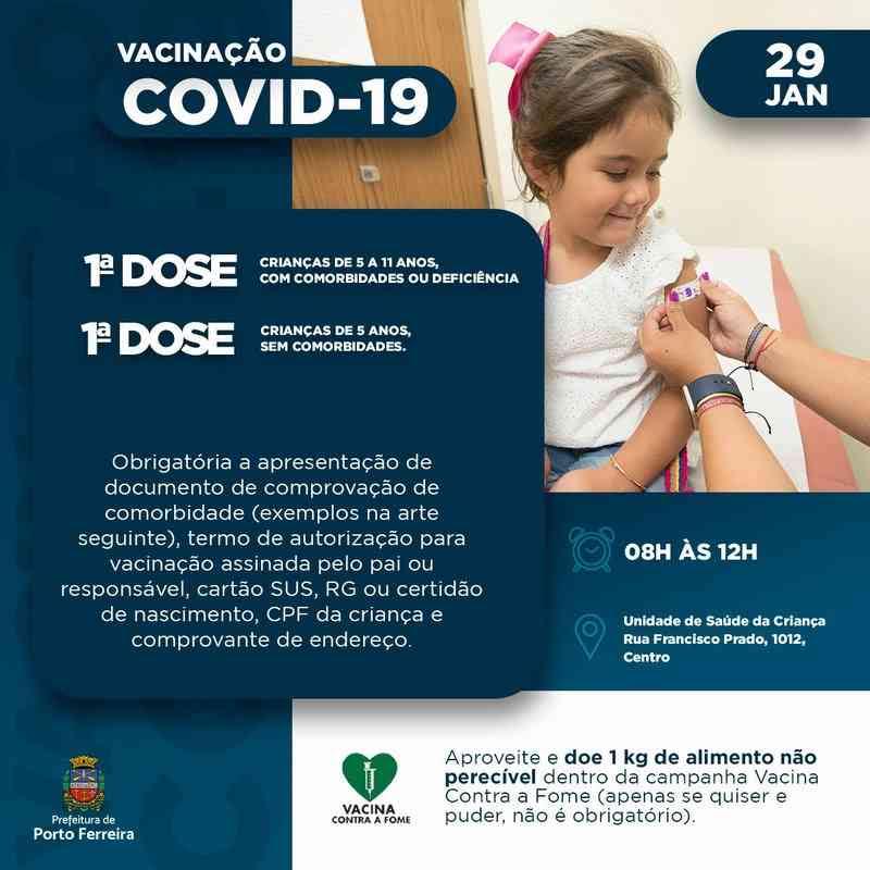 DOCUMENTOS (com e sem comorbidades): é obrigatória a apresentação do termo de autorização para vacinação assinada pelo pai ou responsável; do cartão SUS, de RG ou Certidão de Nascimento, CPF e comprovante de endereço da criança. O termo de autorização está disponível no site oficial da Prefeitura de Porto Ferreira e pode ser acessado AQUI.