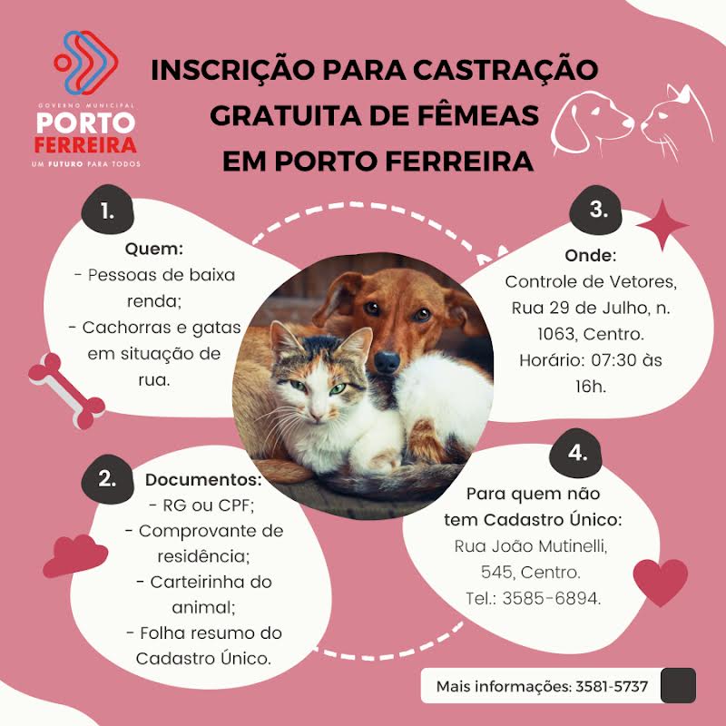 Para animais de rua*, uma entrevista pode ser solicitada pelo e-mail: zoonoses.portoferreira@gmail.com, contendo informações de contato, informações sobre o animal, de preferência com foto ou vídeo, ou ainda, pelo telefone do Centro de Controle de Zoonoses, 3581-5737.