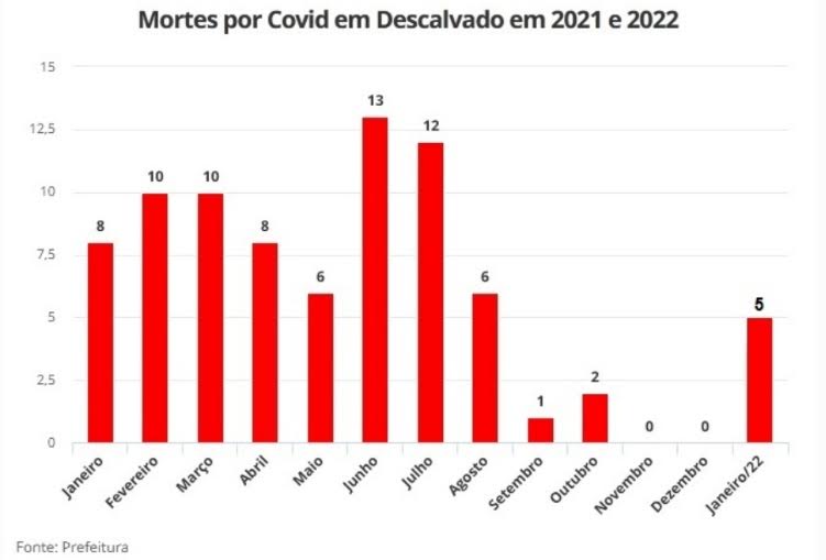Desde que pandemia começou, há quase dois anos, junho de 2021 foi o mês em que houve o maior número de mortes confirmadas pela doença, com um total de 13 óbitos. Na sequencia, aparece julho do mesmo ano (com 12 mortes). Empatados em terceiro, os meses de fevereiro e março (também de 2021) aparecem com um total de 10 óbitos em cada período. Veja, na imagem, a evolução de mortes por Covid-19 em Descalvado, nos anos de 2021 e 2022: