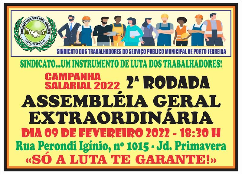 O Sindicato Dos Trabalhadores Do Serviço Público Municipal De Porto Ferreira, convoca os interessados (todos os servidores públicos municipais, associados do sindicato ou não) que no dia 09 de fevereiro do ano de 2022 às 18h15min será realizada na Sede do Sindicato (Rua Perondi Iginio, nº 1015, Jardim Primavera, nesta cidade), em primeira convocação com metade mais dos associados, caso não seja atingido o quorum em segunda convocação as 18h30min, com qualquer número dos sócios presentes (art. 64 do Estatuto Social), para deliberar sobre os seguinte assunto: