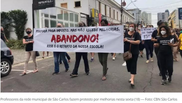 Professores da rede municipal de São Carlos (SP) paralisaram as atividades, na manhã da última sexta-feira (18), como forma de protesto por melhores condições de trabalho. Os profissionais se reuniram por volta das 8h na Praça Coronel Salles e, cerca de uma hora depois, ao som do clássico 'Brasil mostra a tua cara', de Cazuza, saíram em passeata pela Rua Sete de Setembro, em direção ao Paço Municipal. Veja abaixo as principais reivindicações dos professores: