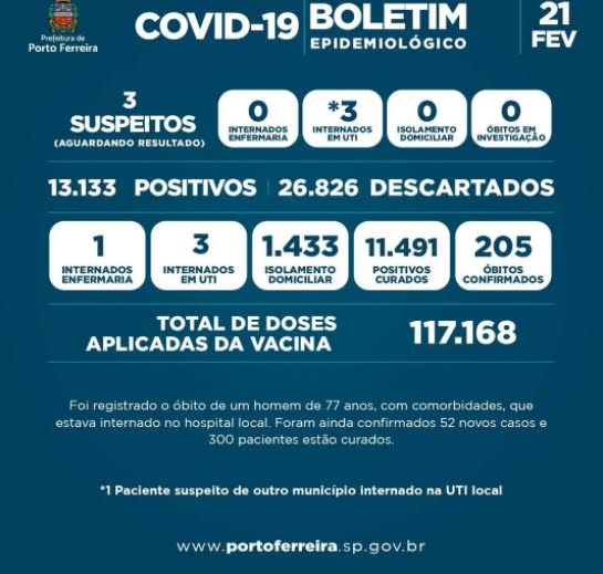 A Vigilância da Secretaria de Saúde de Porto Ferreira divulgou nesta segunda-feira (21/02) o Boletim Epidemiológico nº 677/2022, atendendo à determinação prevista no decreto municipal 1.281/2020.