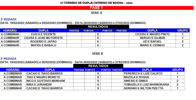 Nos últimos dias 12, 13, 19 e 20 de fevereiro aconteceu a segunda rodada do 5º Torneio de Duplas de Bocha no Clube de Campo das Figueiras, que está dividida nas Séries A e B.