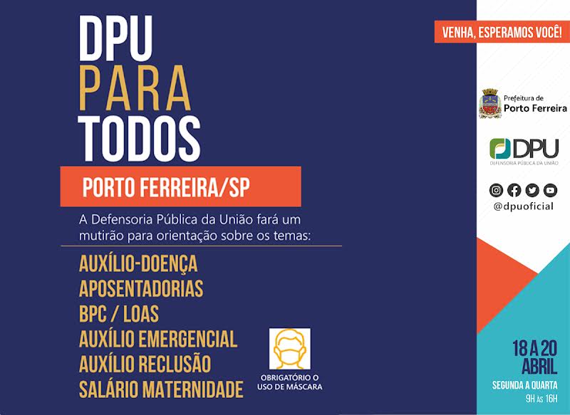 Por meio de parceria entra a Secretaria de Desenvolvimento Social e Cidadania de Porto Ferreira e a Defensoria Pública da União (DPU), a população ferreirense contará com assistência jurídica gratuita, por meio da ação itinerante DPU para Todos.