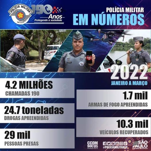 Confira na imagem o trabalho da Polícia Militar de SP em números no período de JANEIRO a MARÇO de 2022.
