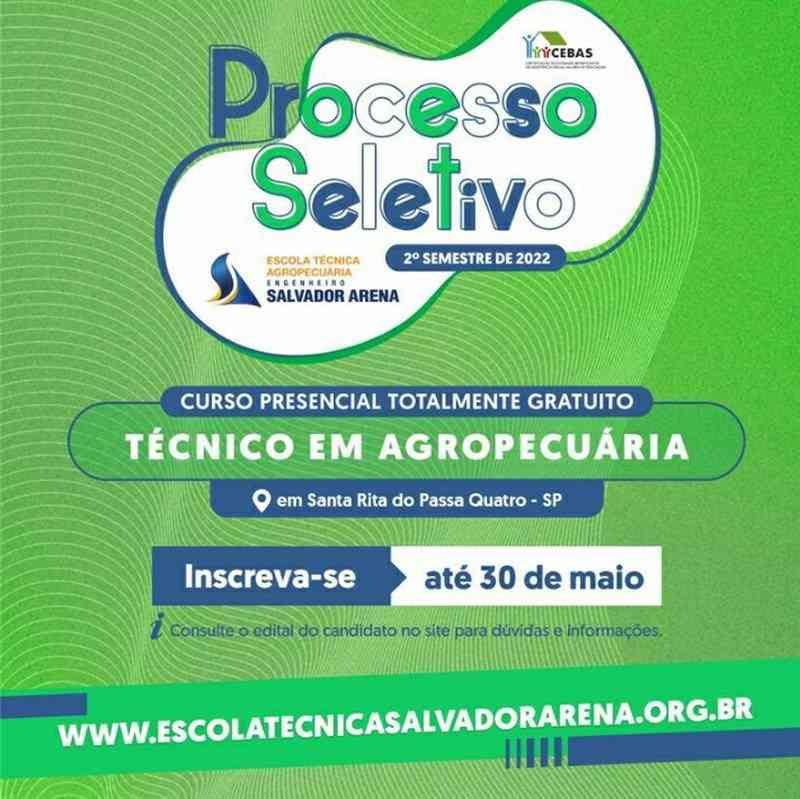 O Centro Educacional Fundação Salvador Arena abriu Processo Seletivo para o Curso Presencial de Técnico em Agropecuária, no Município de Santa Rita do Passa Quatro. O curso é totalmente gratuito e as inscrições serão aceitas até o dia 30 de maio de 2022. Consulte o edital do candidato no site www.escolatecnicasalvadorarena.org.br