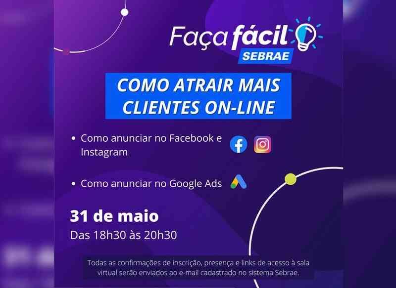 O curso Faça Fácil – Como Atrair Mais Clientes Online será ministrado no dia 31 de maio, das 18h30 às 21h30, via plataforma Microsoft Teams, e as inscrições vão até o dia 30 de maio, pelo link https://inscricao.sebraesp.com.br/kit/turma/25394.