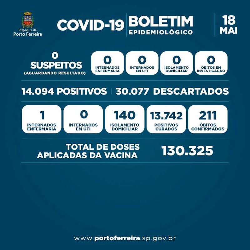 A Vigilância da Secretaria de Saúde de Porto Ferreira divulgou nesta quarta-feira (18/05) o Boletim Epidemiológico nº 763/2022, atendendo à determinação prevista no decreto municipal 1.281/2020.Foram confirmados mais 81 casos, sendo que 40 são notificações do período de 10 a 16 de maio, enviadas à VE por um convênio médico privado. Outros 27 pacientes estão curados.