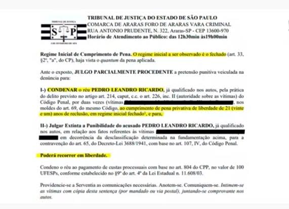 O ex-padre Leadro, cujo nome completo é Pedro Leandro Ricardo foi condenado hoje (19) pelo crime de abuso sexual contra menores entre 2002 e 2006. A decisão da Justiça de Araras (SP) condenou o e-padre a 21 anos de reclusão em regime inicialmente fechado. Leandro poderá ainda recorrer as instânciais superiores, em liberdade. A decisão é do juiz Rafael Pavan de Moraes Filgueira.