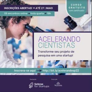 Estão abertas as inscrições para o programa Acelerando Cientistas. O programa é realizado pelo Sebrae for Startups, posicionamento do Sebrae-SP para o ecossistema de startups e executado pela Wylinka, que atua promovendo a inovação e o empreendedorismo de base científica no Brasil. As inscrições são gratuitas e ocorrem até o dia 27 de maio.