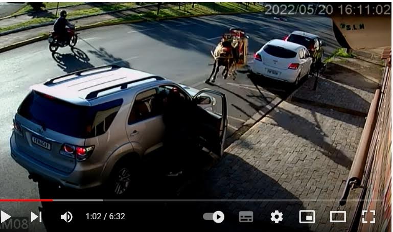 Um cavalo que estava atrelado à uma carroça, sem ninguém nas rédeas, adentrou na avenida acima mencionada, onde com a carroça já com sua lateral sendo arrastada e totalmente desgovernada, “raspou” a lateral de um veículo estacionado.