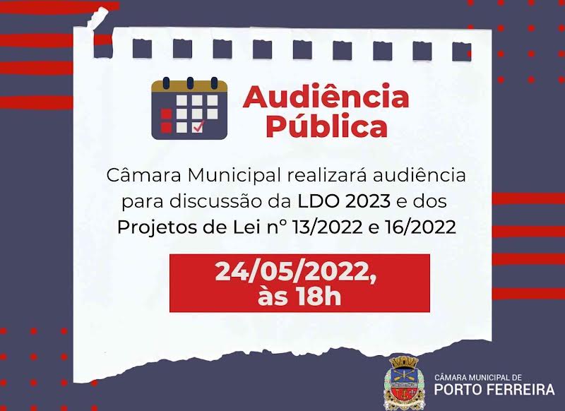 A Câmara Municipal de Porto Ferreira, por meio das Comissões de Finanças e Orçamento e Justiça e Redação, realizará audiência pública para discussão de três projetos de lei na próxima terça-feira (24/05), a partir das 18h, no Plenário SyrioIgnátios, localizado na avenida Engenheiro Nicolau de Vergueiro Forjaz, 1068.