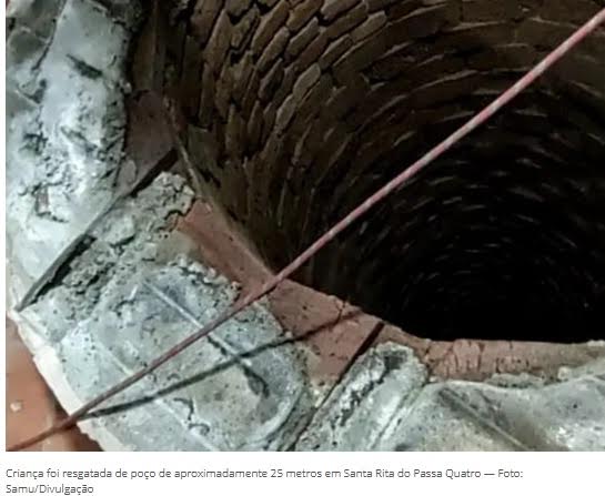 Uma criança caiu em um poço seco de aproximadamente 25 metros de profundidade no distrito de Santa Cruz da Estrela, pertencente ao município de Santa Rita do Passa Quatro, na noite de sábado (28). O acidente aconteceu por volta das 21h no quintal de uma antiga casa onde atualmente funciona uma pizzaria.