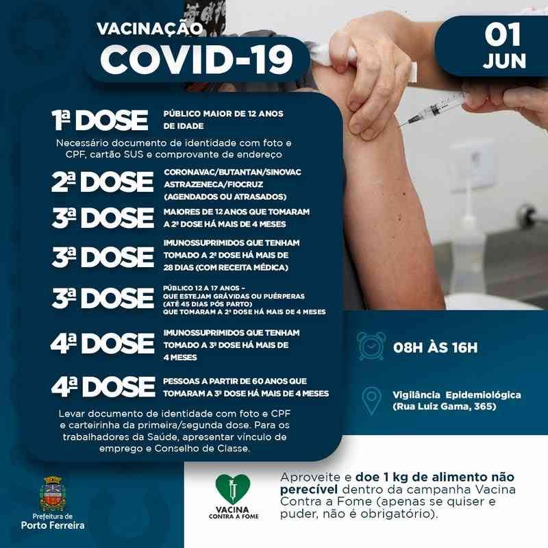 A Vigilância Epidemiológica de Porto Ferreira informa como vai ser o esquema de vacinação contra covid-19 e gripe (influenza) nesta quinta-feira (02/06), das 8h às 16h.