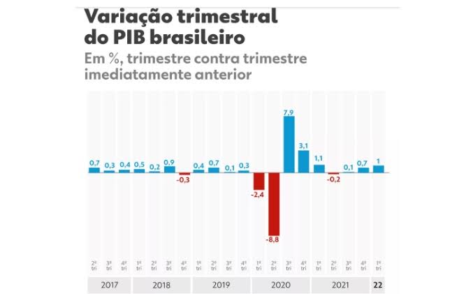 Com o resultado, o PIB, que é a soma dos bens e serviços produzidos no Brasil, chegou a R$ 2,249 trilhões. As informações compreendem o período de janeiro a março deste ano e, por isso, não refletem possíveis consequências da guerra entre Ucrânia e Rússia no Leste Europeu, uma vez que os conflitos tiveram início em 24 de fevereiro.