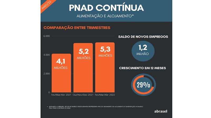 O IBGE divulgou na última terça-feira (31) os números do emprego do país, medidos pela PNAD Contínua. E a boa notícia é que a queda na taxa de desocupação para 10,5%, menor índice para o trimestre desde 2015, teve contribuição decisiva do setor de bares e restaurantes. O aumento do emprego em alojamento e alimentação (subsetor no qual os estabelecimentos de alimentação fora do lar representam em torno de 90%, segundo a Abrasel) foi de 29,2% em relação ao primeiro trimestre de 2021, com a criação de 1,2 milhão de novas vagas no período.