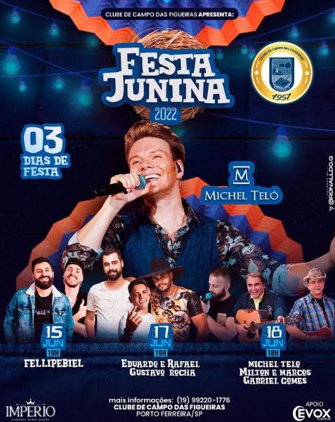 A Diretoria Ação e Resultado, do Clube de Campo das Figueiras, de Porto Ferreira (SP), informa que a sua tradicional Festa Junina terá as datas transferidas de 3 e 4 de junho para os dias 17 e 18 de junho, com os mesmos artistas, e ainda haverá agora um terceiro dia, 15 de junho (quarta-feira, véspera de feriado).