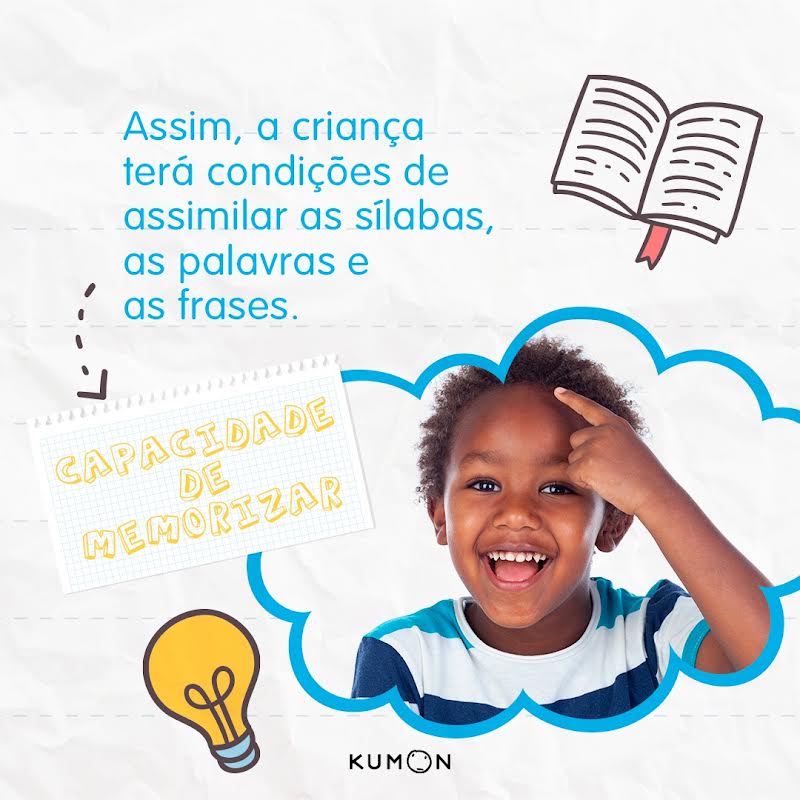 O processo de alfabetização pelo método Kumon é por meio do "repetir, memorizar e ler sozinho". Desenvolver no aluno a capacidade de ler sozinho desde palavras isoladas, até pequenas histórias.