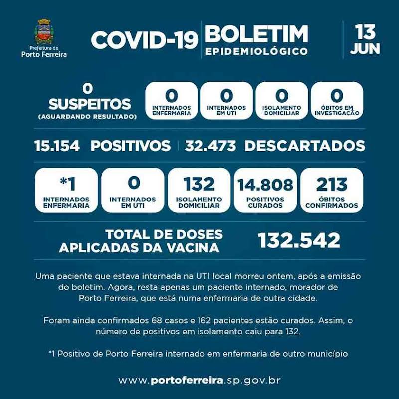 A Vigilância da Secretaria de Saúde de Porto Ferreira divulgou nesta segunda-feira (13/06) o Boletim Epidemiológico nº 789/2022, atendendo à determinação prevista no decreto municipal 1.281/2020.