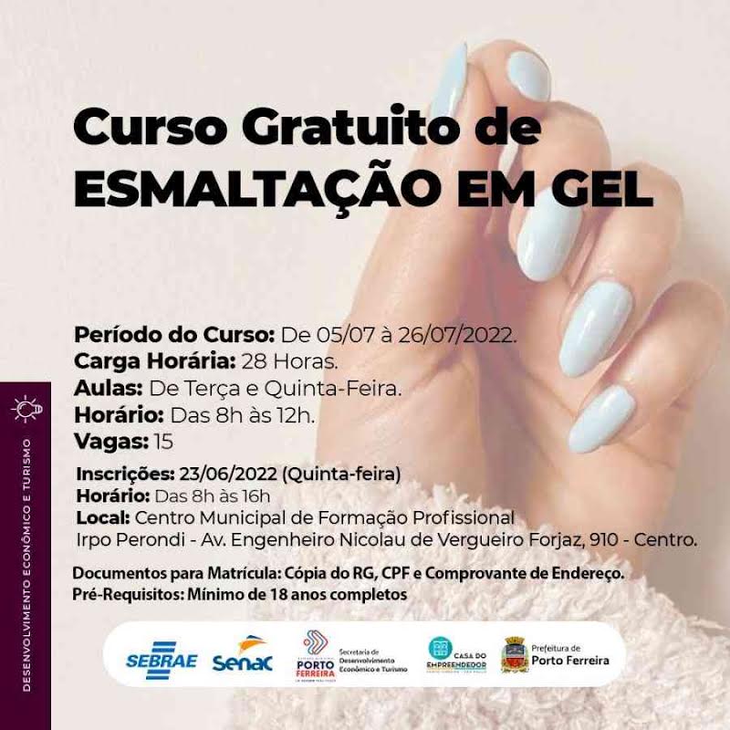A Prefeitura de Porto Ferreira, por meio da Secretaria de Desenvolvimento Econômico e Turismo e Centro de Formação Profissional Irpo Perondi, em parceria com o Sebrae (Serviço Brasileiro de Apoio às Micro e Pequenas Empresas) e Senac (Serviço Nacional de Aprendizagem Comercial), vai abrir inscrições para o curso gratuito de esmaltação em gel.