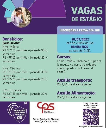 Centro Paula Souza está com processo seletivo aberto para contração de estagiáiros(as). Veja mais informações na imagem