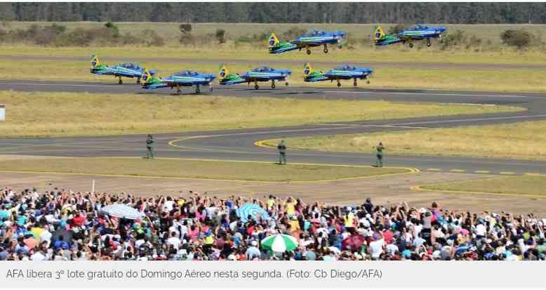 A Academia da Força Aérea (AFA) disponibilizou os ingressos gratuitos do 3º lote do tradicional evento da Esquadrilha da Fumaça de Pirassununga, o Domingo Aéreo, ontem, segunda-feira (1º). Para garantir o ingresso, é necessário acessar a plataforma online Sympla, (clique aqui para adquirir o convite).