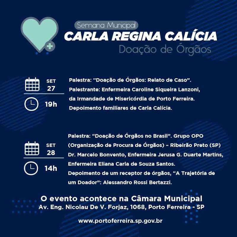 A Prefeitura de Porto Ferreira, por meio da Secretaria de Saúde, realiza nos dias 27 e 28 de setembro a 3ª Semana Carla Regina Calícia, em conscientização e incentivo à doação de órgãos. O evento acontece na Câmara Municipal.