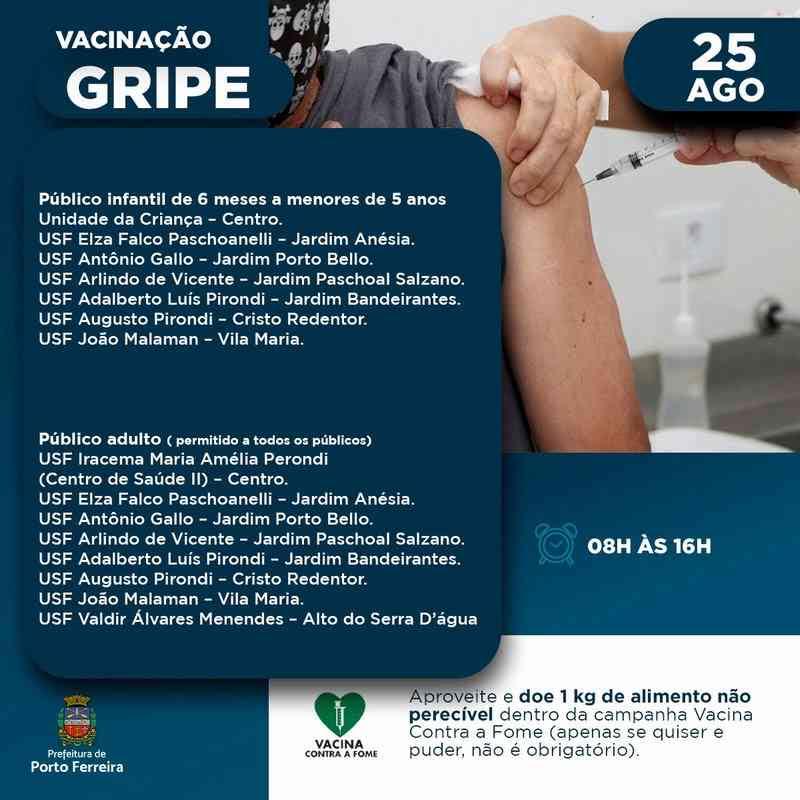 A Vigilância Epidemiológica de Porto Ferreira informa como vai ser o esquema de vacinação contra covid-19 e gripe (influenza) nesta quinta-feira (25.08), das 8h às 16h.