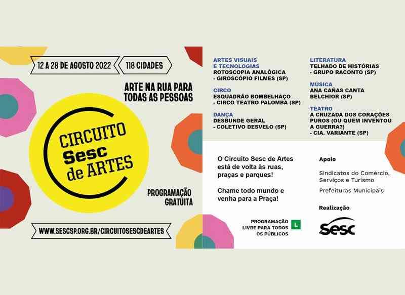 Neste domingo (28/08), a partir das 16 horas, na praça Cornélio Procópio (central), acontecem as atividades do Circuito Sesc de Artes, que chega aos municípios que fazem parte da área de atuação de unidades do Sesc, com ações artísticas que buscam provocar novas percepções, reflexões e vivências.